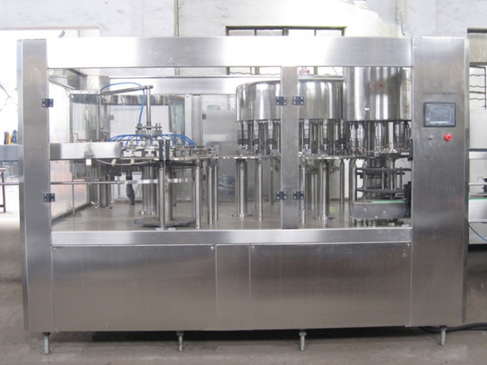 9.灌裝及封蓋:灌裝主要有無菌冷灌裝和無菌熱灌裝2種方式。果汁飲料灌裝為保證質(zhì)量往往采用無菌熱灌裝,要求:灌裝時的溫度不低于90℃,灌裝后瓶內(nèi)溫度不低于85℃。灌裝后要馬上封蓋。封蓋時要調(diào)整封蓋頭合適的扭矩,確保封口嚴密。洗瓶、灌裝和封蓋三合一熱灌裝機。