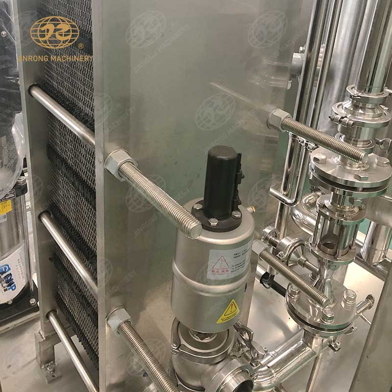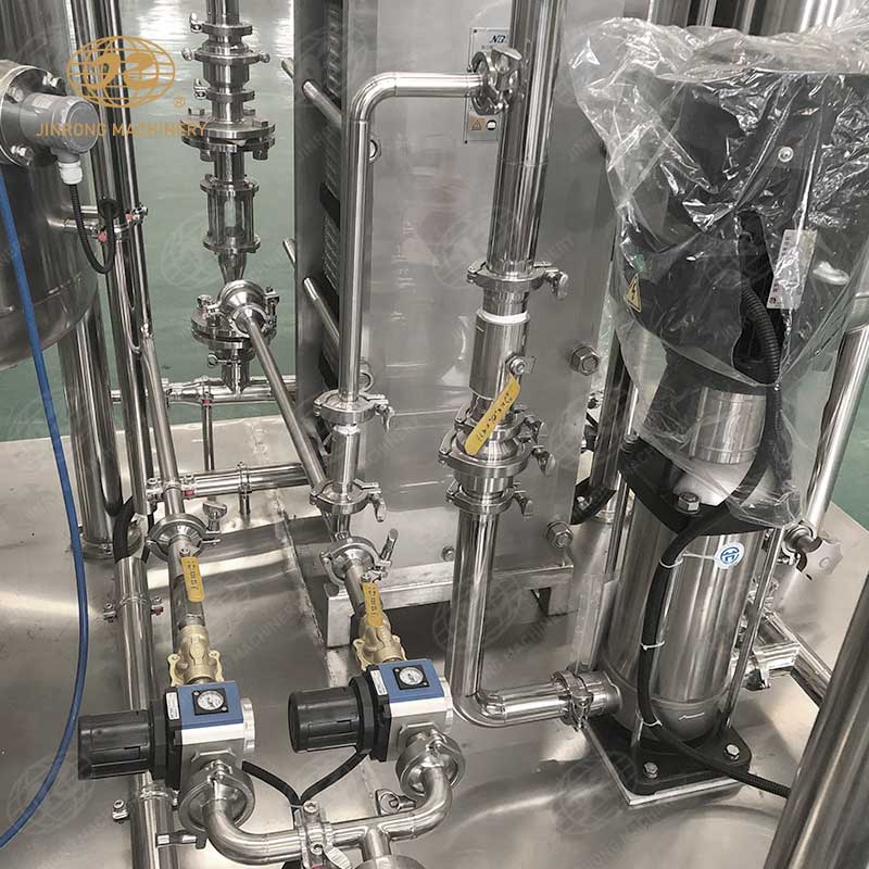 4. 混合機器采用板式換熱器進行冷卻。當飲料水和稀糖漿通過帶刻度的手動調節(jié)閥進入混合罐時,混合泵升壓后進入板式換熱器,充分混合飲料水和稀糖漿。同時,利用板式換熱器的固有特點,在另一側加冰水,不僅可以混合飲料水和細糖漿,還可以降低溫度,提高碳化效果。在進入之前,可以添加適當的二氧化碳,以獲得更好的糖,水和天然氣混合物。
