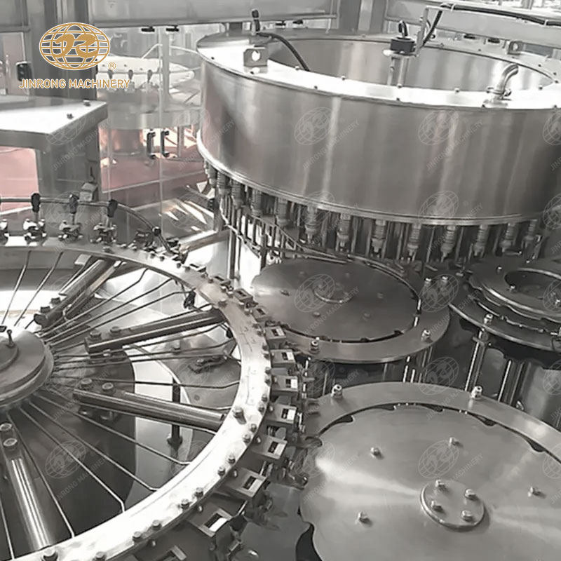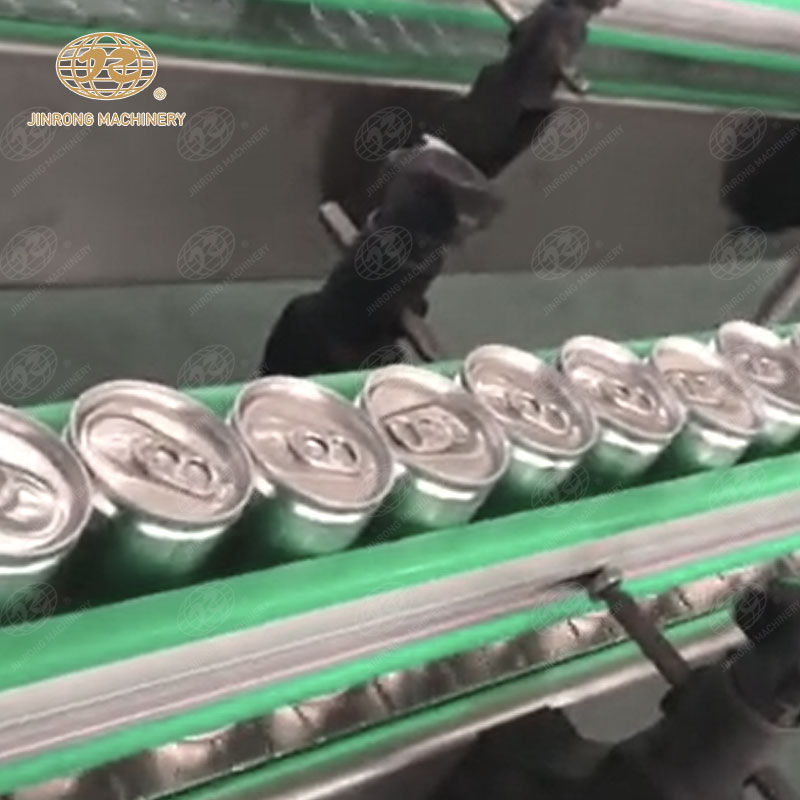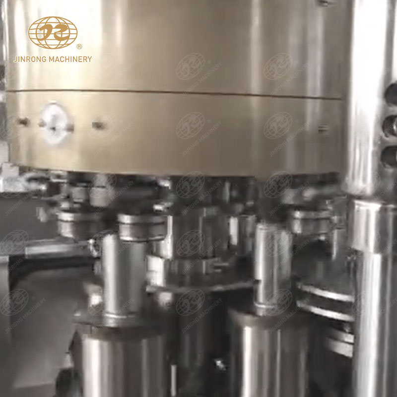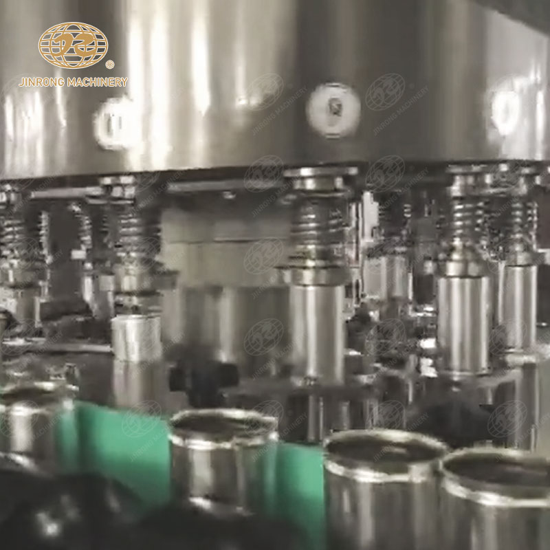 易拉罐依次由進(jìn)罐螺桿和進(jìn)罐星輪推到托罐臺(tái)上。托罐臺(tái)上的空罐上升頂開灌裝閥的密封墊進(jìn)行灌裝,灌滿的易拉罐被送到輸送帶上,送進(jìn)封罐機(jī)封蓋。封蓋機(jī)在凸輪的控制下通過取蓋、蓋翻邊、卷邊等動(dòng)作完成封蓋后,易拉罐進(jìn)入實(shí)罐輸送系統(tǒng)。
